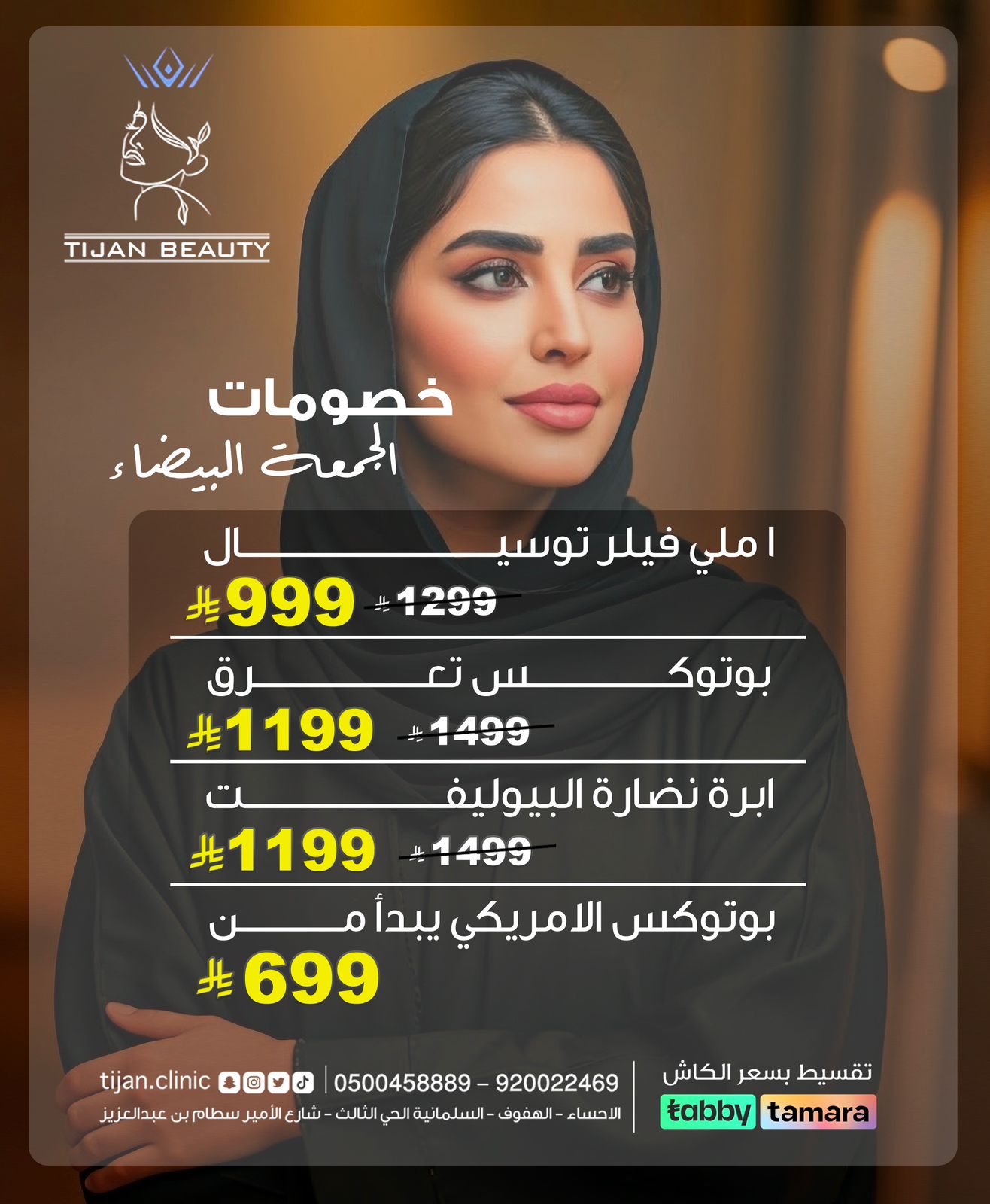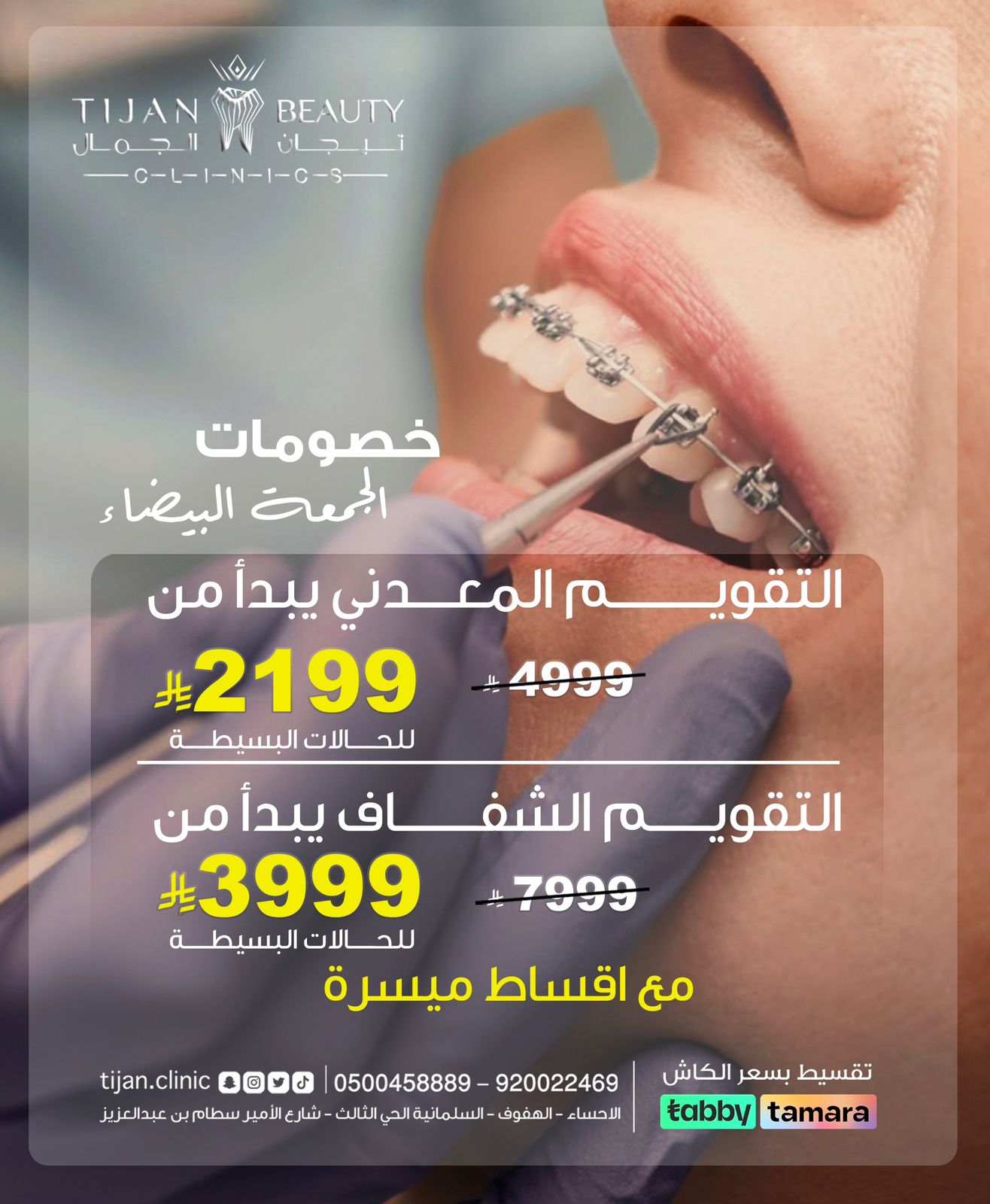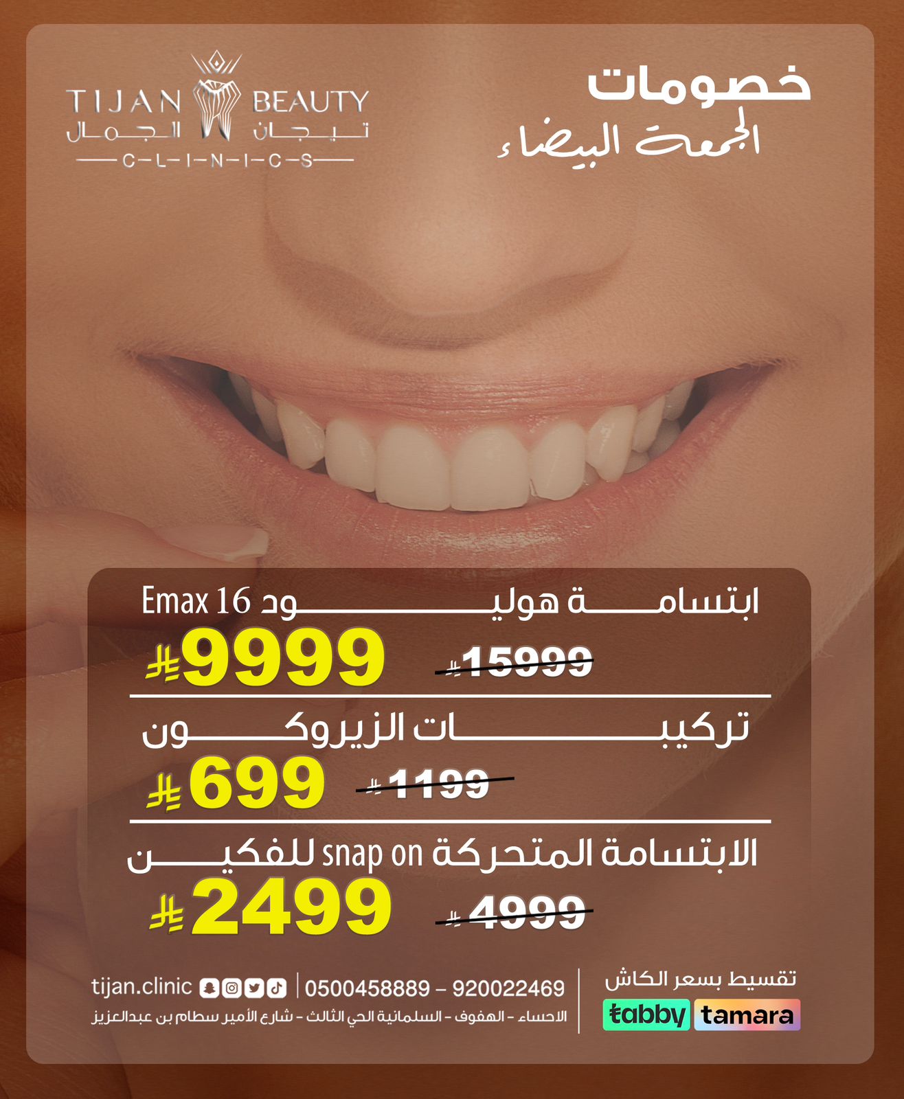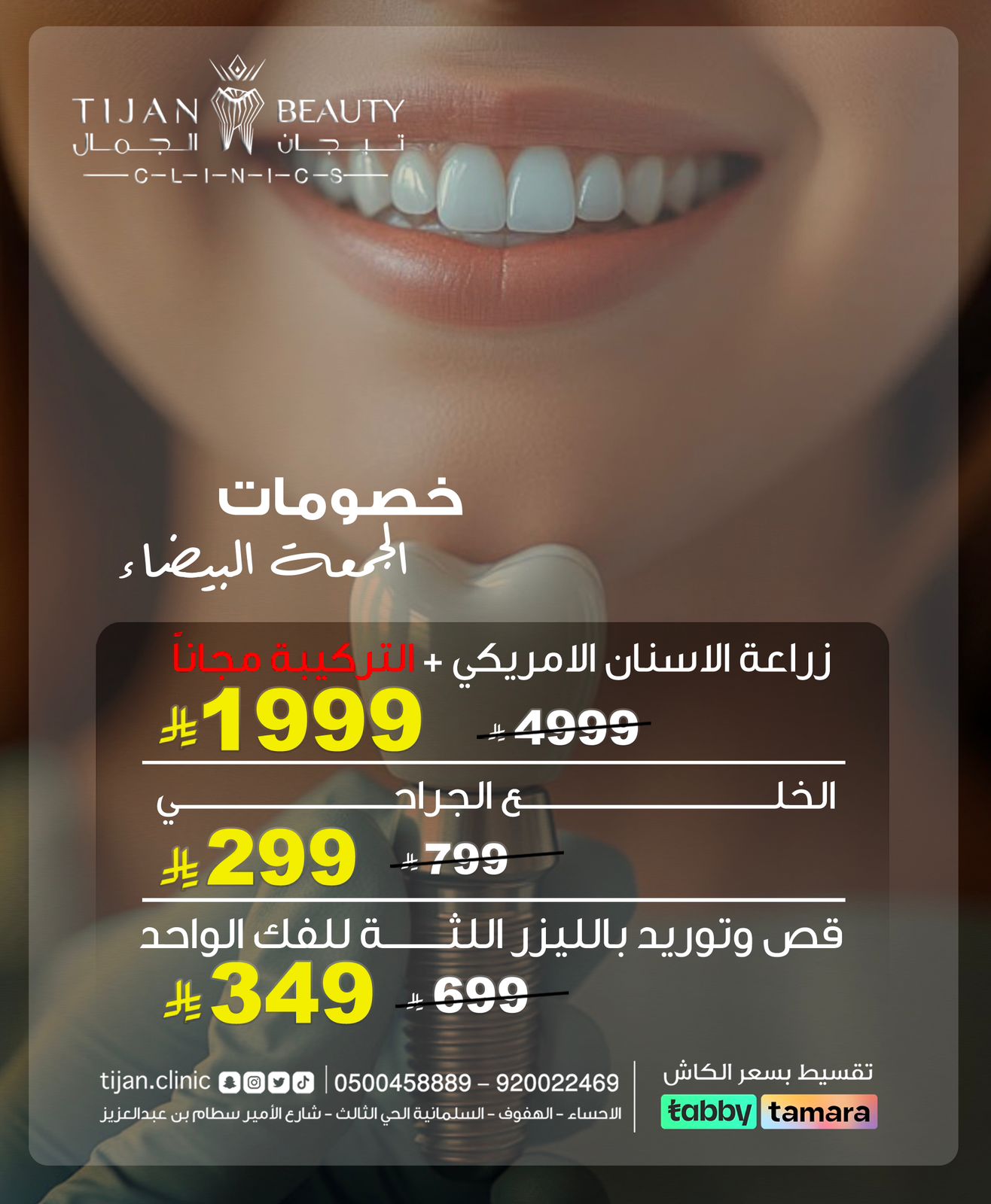 تحتاج إلى خدمة طبية ؟ أتصل على : 500458889 (966+) ساعات العمل نستقبلكم من 9:00 صباحا إلى 10:00 مساء احجز موعدك الان من نحن مركز تيجان الجمال متخصص لطب الأسنان والجلدية والليزر والتجميل تيجان الجمال رائدة في خدمات التجميل الشاملة: تجميل الأسنان، العناية بالبشرة، وعلاجات جلدية متطورة اقراء المزيد لا تنتظر ابدأ رحلتك اليوم واختر خطة الدفع المناسبة لك اتصل بنا اليوم لتحديد موعد استشارتك! اتصل الان جمالك مضمون مع عروض تيجان الجمال لا تنتظر ابدأ رحلتك اليوم واختر خطة الدفع المناسبة لك احجز العرض الان خدماتنا لسنا مجرد عيادة.. نحن شركاء رحلة جمالك الدائمة مهما كانت احتياجاتك التجميلية: ابتسامة هوليود، علاج اللثة، أو ترميم الأسنان، ستجد الخطة المثالية هنا خدمات الجلدية وتجميل البشرة نضرة بإشراقة الشباب.. تجميلٌ بتقنيات عالية ودقة طبية فائقة قراءة المزيد... خدمات تجميل الأسنان ابتسامتك عنوان ثقتك.. تجميل الأسنان بتقنيات حديثة لجمالٍ مشع ودائم. قراءة المزيد... قبل & بعد Our custom veneers effectively address imperfections like chips and discoloration, giving you a radiant, confident smile. اتصل بنا اليوم لتحديد موعد استشارتك! اتصل الان تواصل معنا احصل على استشارة مهنية مجانية شارع الأمير سطام بن عبد العزيز, حي السلمانية الثالث,الهفوف,الأحساء 500458889 (966+) info@tijan-clinic.com نستقبلكم من:9:00 صباحا الى 10:00 مساء احجز موعدك الان