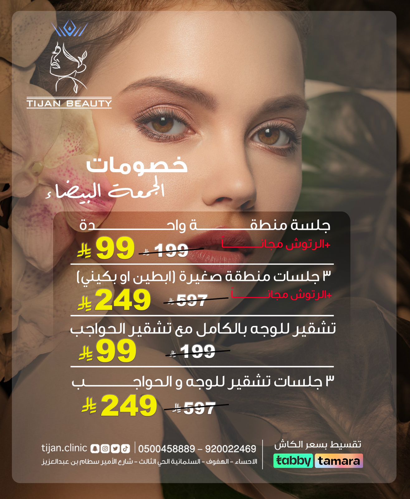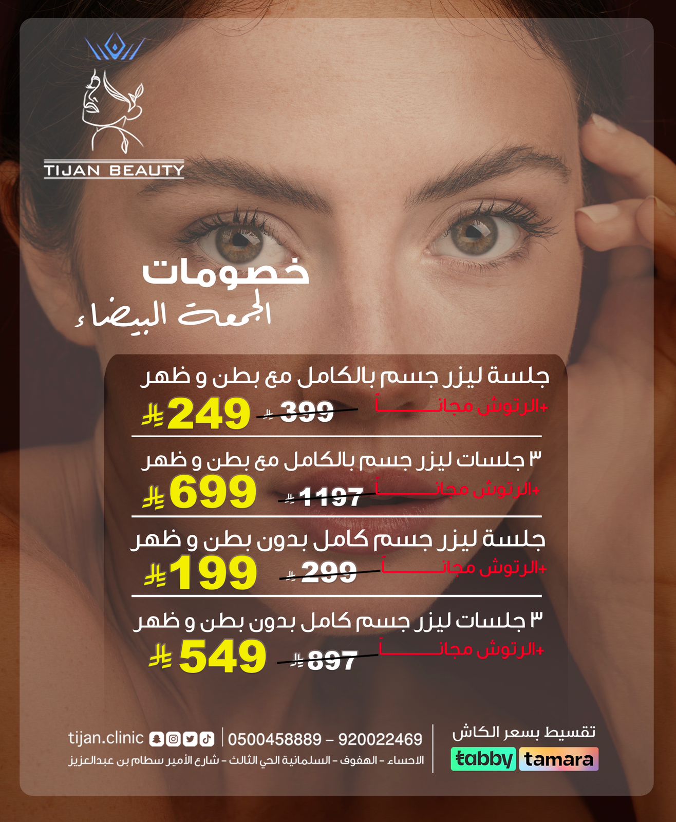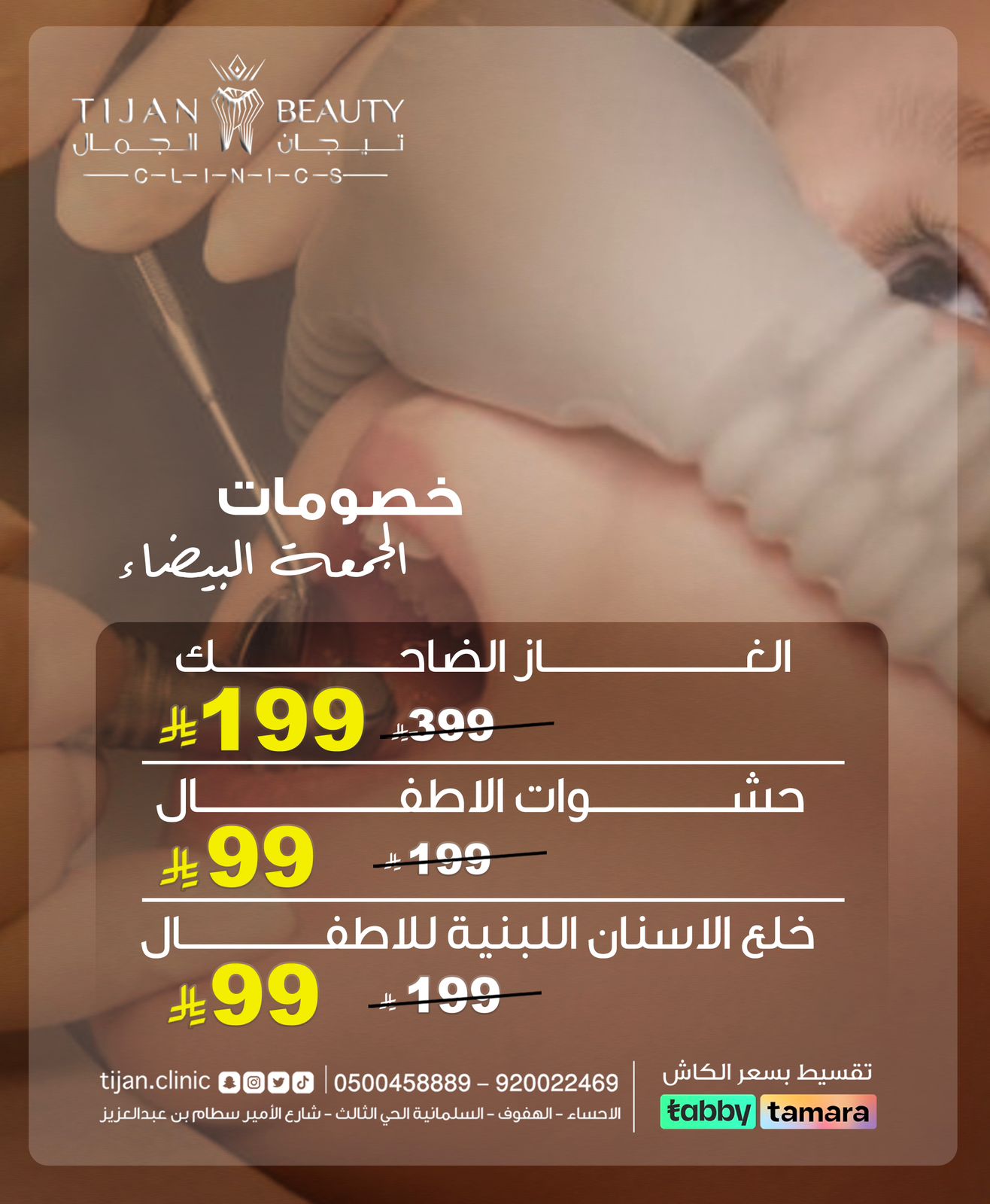 تحتاج إلى خدمة طبية ؟ أتصل على : 500458889 (966+) ساعات العمل نستقبلكم من 9:00 صباحا إلى 10:00 مساء احجز موعدك الان من نحن مركز تيجان الجمال متخصص لطب الأسنان والجلدية والليزر والتجميل تيجان الجمال رائدة في خدمات التجميل الشاملة: تجميل الأسنان، العناية بالبشرة، وعلاجات جلدية متطورة اقراء المزيد لا تنتظر ابدأ رحلتك اليوم واختر خطة الدفع المناسبة لك اتصل بنا اليوم لتحديد موعد استشارتك! اتصل الان جمالك مضمون مع عروض تيجان الجمال لا تنتظر ابدأ رحلتك اليوم واختر خطة الدفع المناسبة لك احجز العرض الان خدماتنا لسنا مجرد عيادة.. نحن شركاء رحلة جمالك الدائمة مهما كانت احتياجاتك التجميلية: ابتسامة هوليود، علاج اللثة، أو ترميم الأسنان، ستجد الخطة المثالية هنا خدمات الجلدية وتجميل البشرة نضرة بإشراقة الشباب.. تجميلٌ بتقنيات عالية ودقة طبية فائقة قراءة المزيد... خدمات تجميل الأسنان ابتسامتك عنوان ثقتك.. تجميل الأسنان بتقنيات حديثة لجمالٍ مشع ودائم. قراءة المزيد... قبل & بعد Our custom veneers effectively address imperfections like chips and discoloration, giving you a radiant, confident smile. اتصل بنا اليوم لتحديد موعد استشارتك! اتصل الان تواصل معنا احصل على استشارة مهنية مجانية شارع الأمير سطام بن عبد العزيز, حي السلمانية الثالث,الهفوف,الأحساء 500458889 (966+) info@tijan-clinic.com نستقبلكم من:9:00 صباحا الى 10:00 مساء احجز موعدك الان